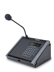 Paging station features 4 direct-select buttons in addition to a standard keypad and a gooseneck microphone
