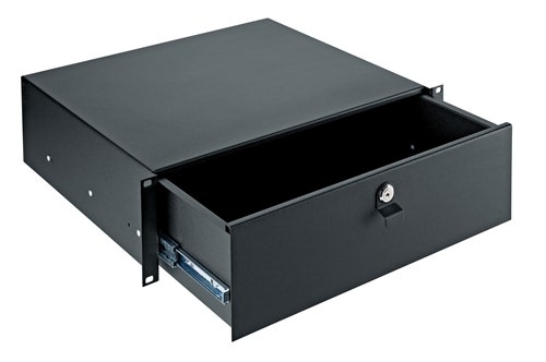 Rackmount Storage - Black. Utility drawer with keylock, 390 mm deep. Heavy-duty slides and steel construction....