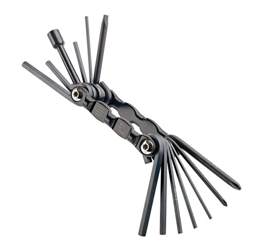 A versatile drum tool with various Allen keys in inch and metric models as well as various screwdrivers and tuning keys.