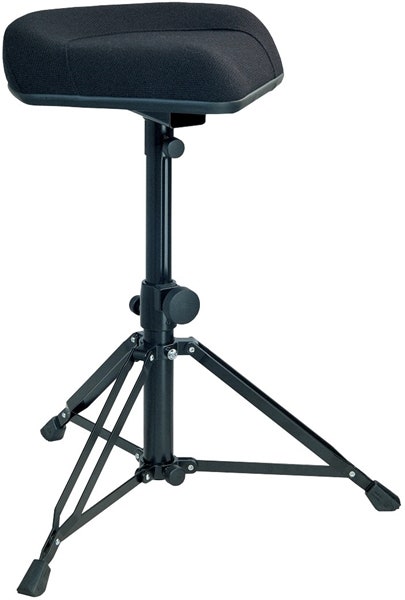 A sturdy, high-quality drum throne featuring an ergonomically-designed seat. Wobble-free locking height-adjustment mechanism is extremely functional and user-friendly. Large 3-foot radius for best-possible stability. Fully-foldable. Molded seat covered with black imitation leather or wear-resistant black fabric.