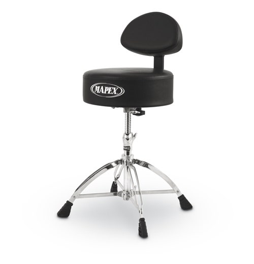 Round Top Drum Throne with Back Rest and 4 Double Braced Legs. 14" x 4" vinyl seat. Height: 50,8cm to 66cm with threaded Steel Spindle Height Adjustment.
