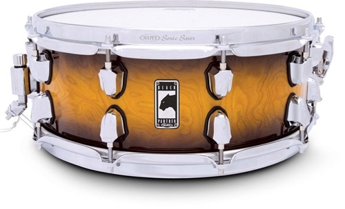 Don't fall under a spell due to its beautiful and seductive looks. This drum is warm and focused. Be careful when handling her. Burl Maple/Walnut/Maple