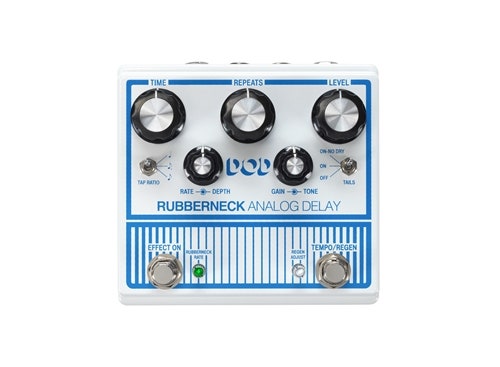 The new DOD Rubberneck Analog Delay has double the features with the cool new double-wide chassis. The Rubberneck boasts over a second of warm and musical 100% analog repeats you crave, along with tap-tempo, subdivisions, and tails. Double concentric knobs give you independent control of the Modulation Rate and Depth as well as Gain and Tone of the delay.