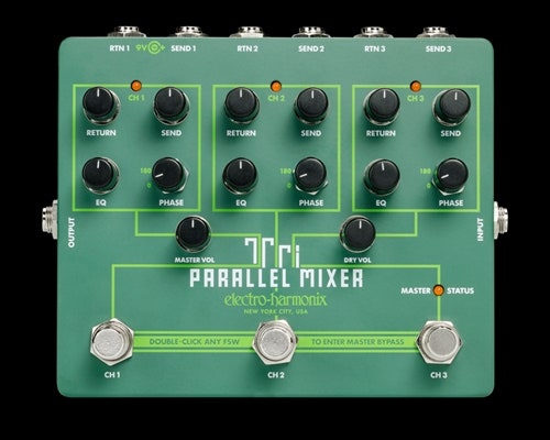 Electro Harmonix’s Tri Parallel Mixer is a powerful effects creation and mixing hub. Three separate FX loops with flexible controls allow for multiple configurations, as follows: