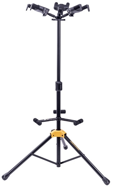 The HERCULES Triple Guitar Stand GS432B PLUS accommodates three instruments and features the upgraded foldable Auto Grip System (AGS) yokes, Instant Height Adjustment Clutch, Specially Formulated Foam (SFF) rubber contacts and the adjustable back rests.