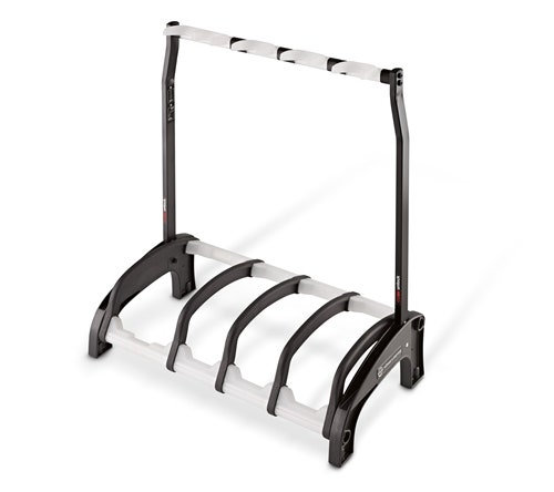 The Guardian keeps one acoustic and 3 electric guitars safe, saves space and keeps instruments clearly arranged for musicians. Special cushioned pads ensure secure, anti-scratch storage of guitars. The flexible protective bars stop the guitars from turning and protect them from unintentional knocks when being picked up or put down. Thanks to its innovative folding mechanism, the Guardian can be carried comfortably and even be stored upright. Highly flexible arms with integrated pick holders protect the guitars and guarantee "unobstructed" strings. Its advantageous slim means that the Guardian can be positioned right next to the wall to save space. In addition, the translucent elements prevent discolouration of nitro lacquer guitars by the stand. An optional caster set 17510 is also available for additional mobility.
