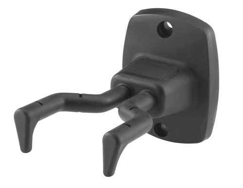 Screw-on type wall mount which accommodates a wide variety of guitar shapes. Features a patented flexible hooking-in and clamping system which quickly and firmly grasps the guitar neck. Studs at support arms provide extra protection. Support arms are covered with non-marring rubber to protect the instrument. Mounting plate made from high quality plastic material.
