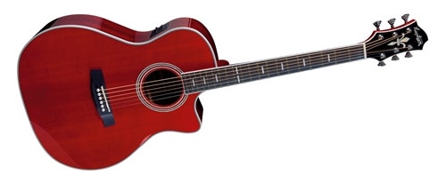 Special Edition Siljan II Grand Auditorium with preamp and cutaway, Transparent Red finish. Provides a warm round and well balanced tone which will only continue to improve as time passes.
