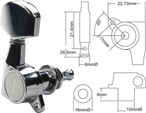 Tuner for electric guitar. 3 left, 3 right. Chrome.
