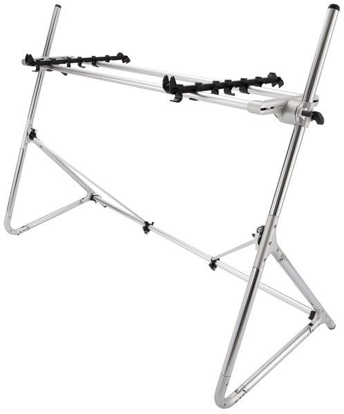 Two polymer keyboard holders with excellent retention strength are included. By adjusting the position of the holders, you can accommodate a variety of keyboard shapes and sizes. To hold a small synthesizer, controller or performance instrument, you can narrow the spacing between the two holders for a compact layout. For a two-level setup, you can adjust the lower holder toward yourself and the upper holder away from yourself so that the upper and lower instruments do not overlap, ensuring that each will be in a convenient playing position. During transport, or when not in use, the holders can fit between the two pipes of the tier for compact storage.