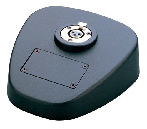 Black cast-iron base with a horizontally mounted XLR-style female socket on upper face. Removable plate, suitable for fitting switches, indicators, controls or connectors, with access to space for additional circuitry. Base is fitted with rear-mounted 3-pole XLR male connector.