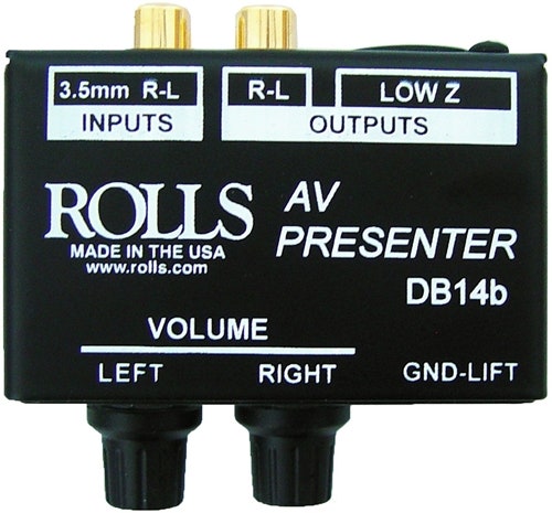 The DB14b is a special purpose direct box for applications where a stereo source signal can be separated, and individual volume controls used for each track. It provides a summed XLR output four uses such as an AV presentation from a laptop computer, or a rehearsing choir to a music track. Hum elimination is also included with the ground lift switch. It has stereo RCA and 1/8\\\" inputs, 2 volume controls, RCA and XLR outputs, and uses no power.