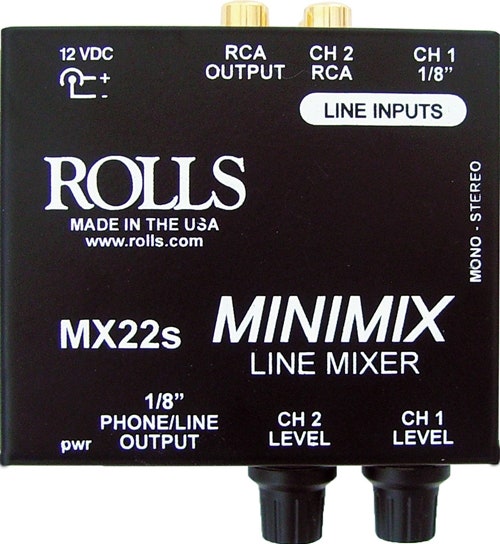MX22s is a 2 Channel mixer for mixing a 1/8" line signal such as a laptop computer or Ipod, and a stereo RCA signal such as a CD player. The MX22s has enough output to drive a power amplifier directly, and is ideal for audio visual and aerobics studio applications. The MX22s can be configured as either Stereo (default) or Mono, by moving a shorting jumper on the PCB. Power adapter is included.