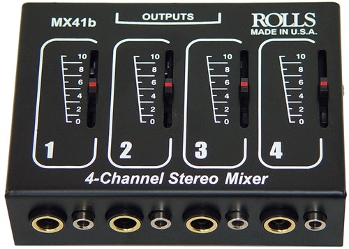This unit is a stereo, four channel passive mixer for expanding a console mixer, mixing instruments, cd or cassette players, or other signal sources. It requires no batteries or other power source. The unit may also be used as a stereo 1-in 4-out box when all controls are turned completely clockwise.