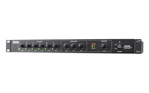 The RANE RM6 is a 6-channel mixer with a built-in, single-channel 120W Class-D amplifier in one rack space. It features combo XLR/TRS input jacks with switchable MIC, LINE, and phantom power. In addition to the amplified output on Euroblock speaker connectors, two XLR line outputs are included. The speaker output options are 4-Ohm or 70/100V line. Added features include mic 1 priority and a 3-band equalizer on the output. The RM6 is compact, versatile and ready to solve any number of audio installation challenges.