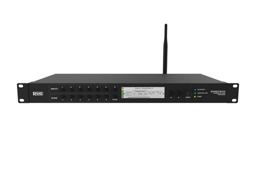 An additional wireless input for Bluetooth® AD2P 4.0 is provided to receive streaming audio from any smartphone or tablet. A contact closure for emergency “Mute All” is provided for integration with alarm systems. All zones have balanced outputs and the 6th zone can work in Stereo or Crossover Mode, easily selectable from the front-panel display. Independent source selection and volume control for each zone is done with Rane’s elegant DRZH wall-control, which comes in an elegant glassy finish to suit all decors. A master remote port accommodates the RAN DR6 7” colored touchscreen for overall control and an ethernet port enables the Zonetech to be accessed and controlled via Wi-Fi from any web browser.