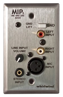A line input Volume control allows level matching and mixing between the music source and the mic. Use it with MP3 players, computer audio outputs, DJ mixers, etc. in banquet halls, gymnasiums and party houses. Works with both dynamic and condenser microphones and passes phantom power from the sound system to the mic input. Line signals are input via a 3.5mm stereo or RCA jacks. The mic input is a balanced female XLR. A Ground Lift switch breaks the ground connection between the inputs and the transformer balanced output screw terminal.