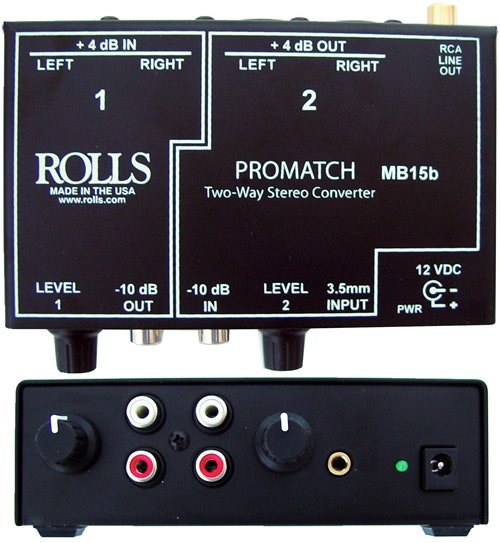The MB15 ProMatch converts consumer level stereo RCA signals to balanced XLR professional line level, and back. One side of the unit, labeled 1, has two XLR inputs and stereo RCA outputs. The other side labeled 2, has stereo RCA inputs and two XLR outputs. Each side has stereo level controls, and an LED indicates that power is applied to the unit. An additional benefit of the MB15 is that it will act as a balanced XLR line level control. By adding a stereo pair jumper between the four RCA jacks (connecting ins to outs), the two Level controls may be inserted into any balanced XLR line.