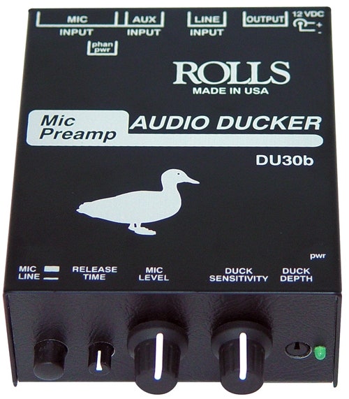 The DU30b is a microphone preamp and background music preamp. When an announcement is made into the microphone, the music is automatically "ducked" under the announcement. Then the music is brought back to it's previous level.