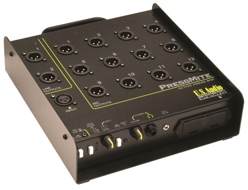 Active press feed distribution box distributes 12 high-quality mic level signals and 2 line level signals with a high degree of isolation between outputs.