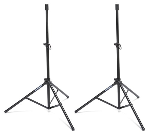 - Two lightweight, telescoping speaker stands, each with tripod base