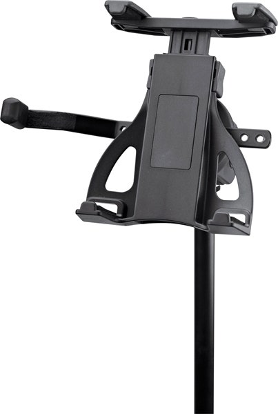 A universal tablet holder for microphone stands. The holder can be attached quickly and easily to any microphone stand with the 3/8” internal thread. A unique tensioning mechanism with a clamping width between 120 and 220 mm means the holder is suitable for holding securely all standard tablet PC models like iPad, iPad Air, iPad mini, Amazon Kindle, Samsung Galaxy Tab, Google Nexus, Asus Transformer or Microsoft Surface. The holder is especially suitable for tablets with a protective sleeve or case. A tension spring means the tablet can be clipped in or removed from the holder in no time at all. The universal clamping jaw with integrated moss rubber protectors ensures a secure hold and eliminates undesired vibration sound problems. The adjustable bracket with felt protectors and a rubber end cap provide additional stability when setting up the tablet holder in the portrait format - so that the tablet is prevented from falling from the holder, even when in use in the toughest of stage environments. The clampin