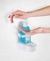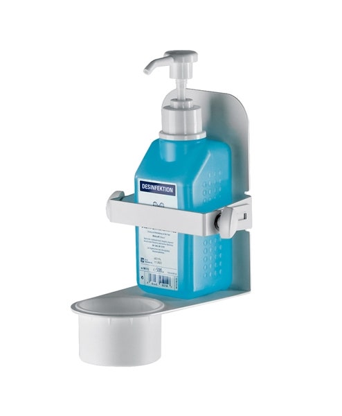 Sturdy holder for disinfectant for space-saving wall mounting.