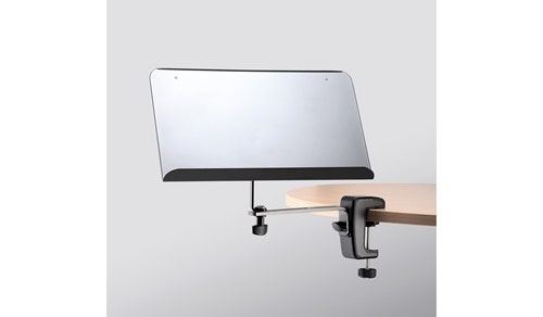 The position (angle) and depth to the stand tube of the tilting 300 x 200 mm sheet music holder is adjustable. The music desk has a depth of 30 mm. The flexible clamp makes it easy to mount the holder in a wide variety of directions. The clamp can be attached to tables (0 to 52 mm thickness). The sturdy metal frame of the clamp is equipped with high-quality plastic inserts and the non-slip coating ensures that the clamp provides a secure and powerful hold. Thanks to the specially formed clamping surface, the clamp can be used on flat surfaces such as tables or shelfing, as well as on round tubing. The holder is collapsible for easy transport.