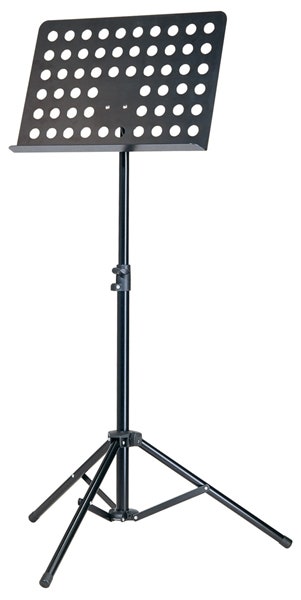 Orchestra music stand with a lightweight perforated steel music desk. Exclusive non-marring height adjustment mechanism to protect the finish.