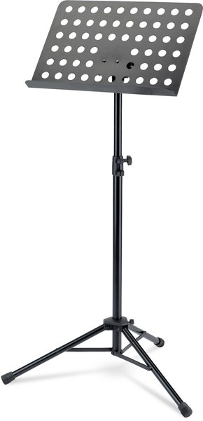 Powder-coated, perforated steel music stand with plastic connecting elements. The music stand rest can be attached and removed using the plastic, user-friendly, quick-release lock. There is a large, easy-to-use wing nut making adjustment of the tilt easy. The stand can be freely adjusted to any height using the non-scratch tension sleeve.
