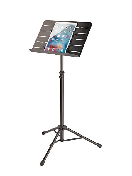 A large wing nut makes it easy to adjust the angle. The music desk“s height is adjusted infinitely variable by a non-marring sleeve that protects the surface. Thanks to the slots and the adjustable clamping bolts with rubber caps, the music stand can also be used as a tablet holder. To secure the tablet, the clamping bolts are pressed against the tablet and fixed with the integrated knurled screws.
