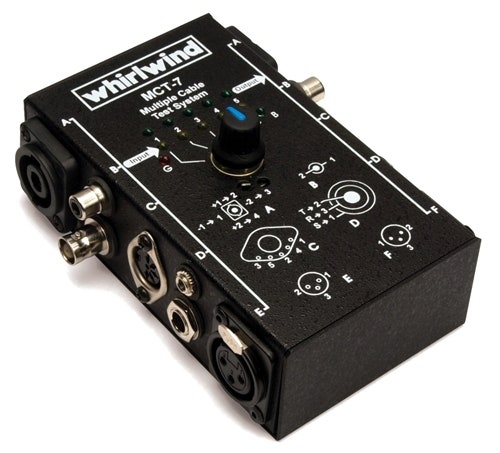 Kabeltestare för XLR, TRS tele, 3.5 mm tele, 5-polig DIN, BNC, NL4 och RCA i alla kombinationer. Omkopplare ger möjlighet att testa varje ledare i kabeln för att analysera den interna konfigurationen.