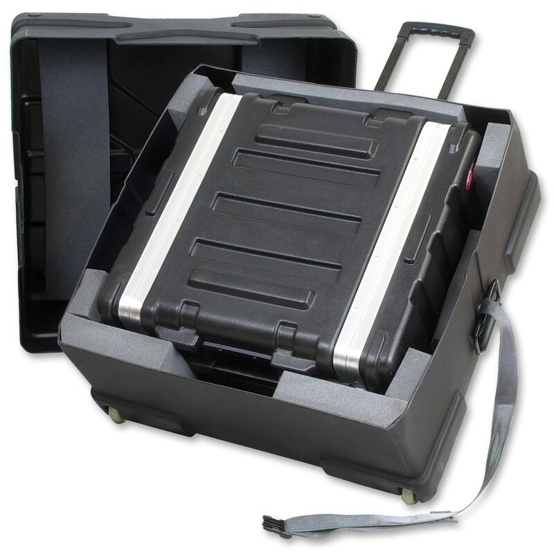 Invändigt stötdämpad transportväska med hjul och utdragbart handtag. För stötsäker transport av 4HE racklådor. Invändiga mått: 55 x 55 x 21,6 cm.