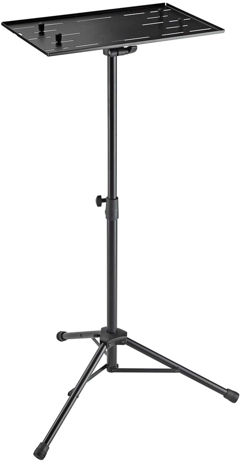 To secure the laptop, the clamping bolts are pressed on the laptop using wing nuts. The height of the stand can be adjusted variably.