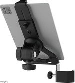 Universal tablet holder with a convenient clamping mechanism for tablets ranging in size from approx. 10" to 16" in horizontal - and approx. 7" to 13" in vertical position. The clamping range of the tablet PC holder is between 155 and 307 mm. The tablet holder is made of bio-based plastic. These plastics contain a proportion of over 50% up to 100% of renewable vegetable raw materials. The use of renewable raw materials helps to conserve limited petroleum resources and reduce harmful CO2 emissions. More information on bio-based plastics at: bioplastic.k-m.de. The holder is also particularly suitable for tablets with a protective cover or case up to 20 mm thick. The overlapping clamping jaws with integrated rubber pad guarantee a secure hold and eliminate unwanted vibration noise. The function of the operating elements on the device is not impaired. The holder can be swivelled and tilted, allowing each user to position it individually. The swivel movement can be adjusted from easy to tight by means of a clamping screw. The holding arm with clamping element is suitable for clamping to tube diameters up to 30 mm.