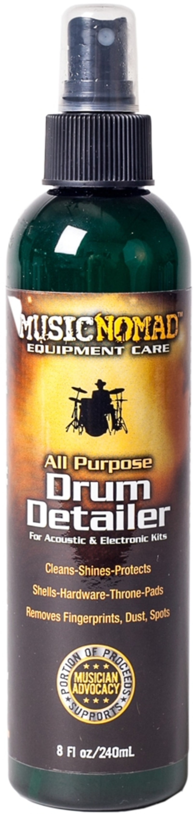 Play it loud and play it proud. Let MusicNomad's Drum Detail Polish do the dirty work and safely clean your entire drum set fast and easy. A single spritz from our atomizer cleans drum shells, hardware, electronic drum pads, and drum thrones. It even can be used for light duty cymbal cleaning for dirt and grime removal. Our anti static agents help reduce dust from binding to your drum set. Safe on all matte and lacquer finishes, our water based formulation is infused with gloss enhancers & UV protectants to give your drums a long lasting great shine. DW Drums even recommends our polish for proper care of their performance and collector’s series drums. Works great on other brands such as Pearl, Tama, and Zildjian. Small in size but big on results you can take it everywhere and it even smells great!
