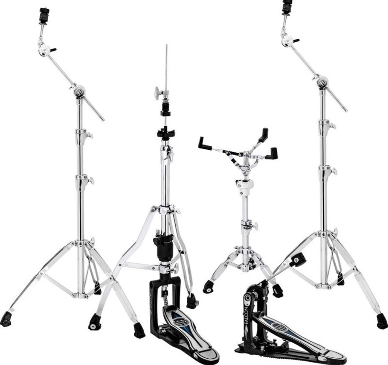 Article number 4045100Falcon Series Hardware Pack, including 2pcs BF1000 Cymbal Boom Stands, SF1000 Snare Stand, HF1000 Hi-hat Stand and PF1000 Bass Drum Pedal. Chrome.