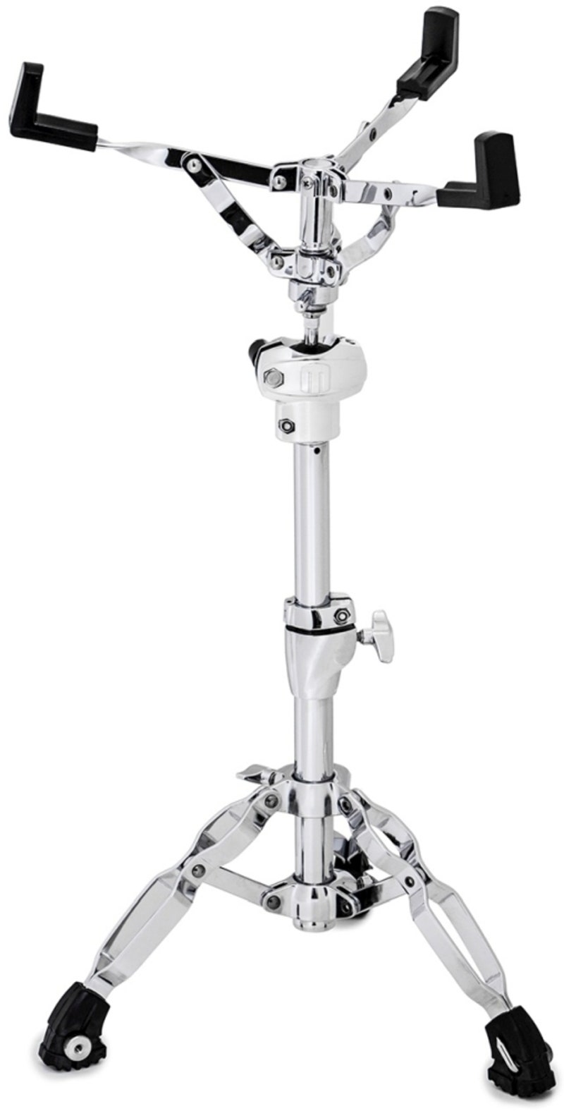 The basket is centered directly over the stand base to improve the balance of heavier drums and to allow unobstructed positioning of the feet between the pedals. The adjustable base height allows the entire center tube and basket to drop down fully, providing room for the added height of deeper snares. The high-friction rubber feet with retractable spikes for rugs or mats stop the stand from shifting around during aggressive play.