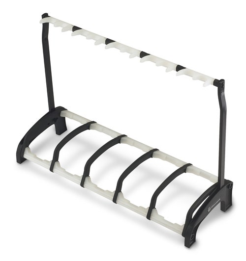 Holds 5 guitars securely, saves space and allows you an easy overview of your guitars. Ideal for use in the studio, on stage in a shop or at home. No matter whether you have acoustic, electrical or bass guitars, the special instrument-compatible supports protectively hold max. 5 guitars. The protective bars stop the guitars from rotating and prevent inadvertent removal or knocks or bumps when taking the guitars from the stand or placing them. The soft pads made of high quality thermoplastic elastomer have cushioning characteristics. Therefore they protectively take the weight of the guitar and avoid damages of the instrument. The innovative folding mechanism used on the - Guardian« allows the stand to be carried easily and it can be left standing upright. Highly flexible, sub-divided support arms with integrated pick holders mean the guitar can be held from either side (right or left) and that the strings are untouched. The structural design allows the - Guardian« to be positioned against a wall.