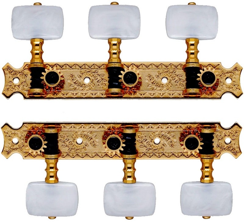 Tuner for nylonstring guitar. Gold, white pearloid buttons.