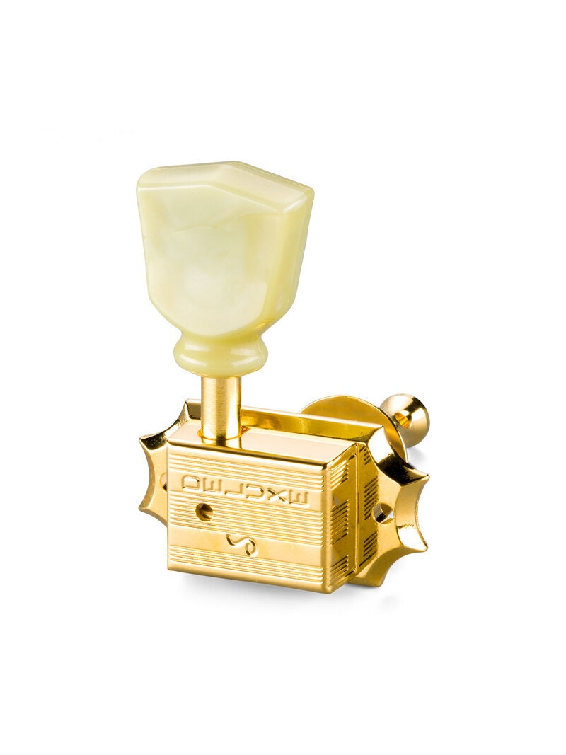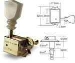 Tuner for guitar. 3 left, 3 right. Gold.