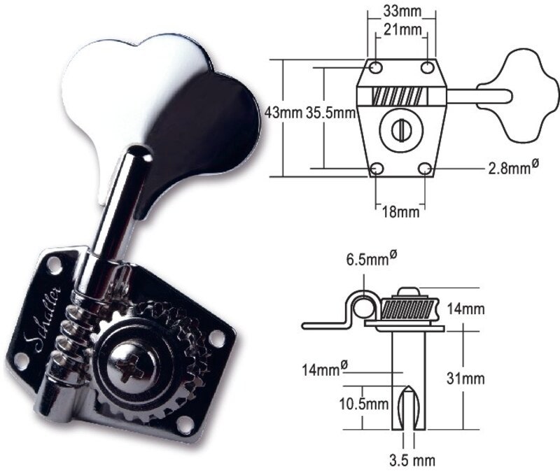 Vintage style tuner for bass. Open. 2 left, 2 right. Chrome.