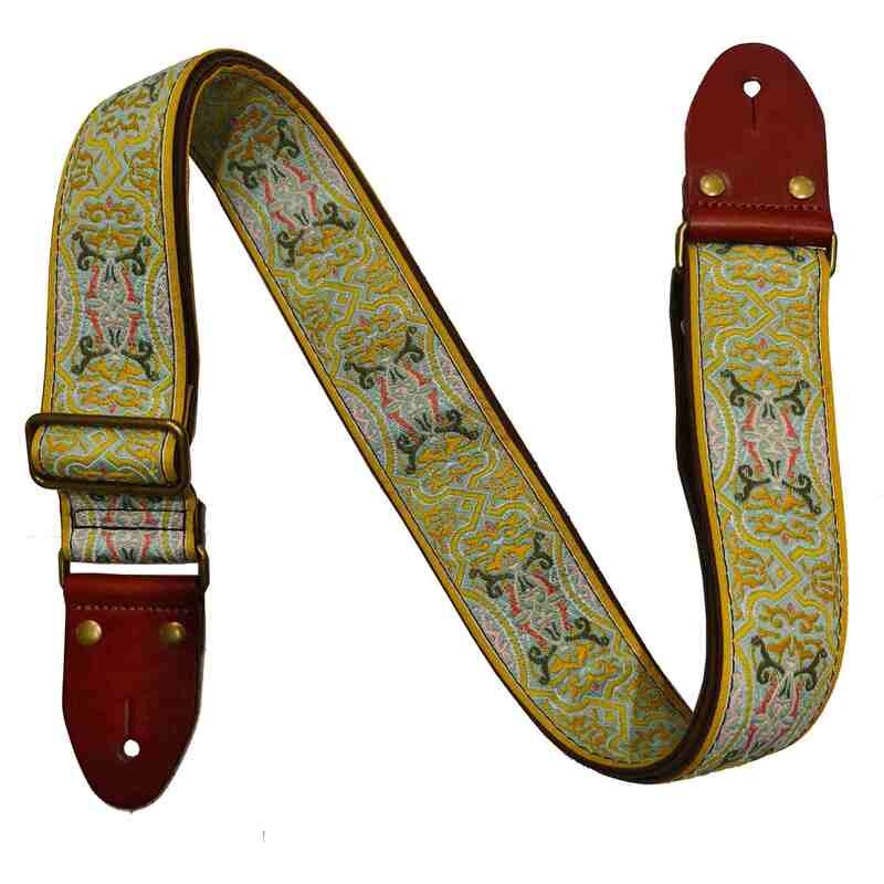 Article number 34218432" woven guitar strap with classic edging pattern, and garment suede leather backing.