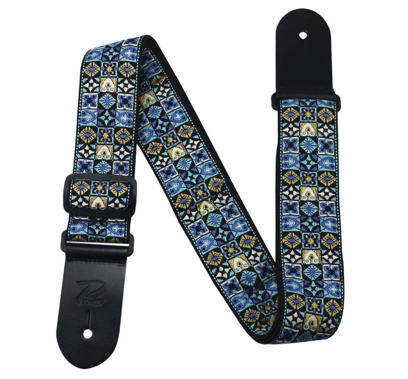 2" Jacquard weave guitar strap with classic edging pattern. Padded nylon backside for extra comfort, Italian leater ends and tr-glide adjustments.