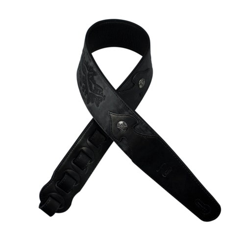 2,5" Italian suede leather guitar strap, tooled with a "Cross" design, and foam padded garment leather backing..