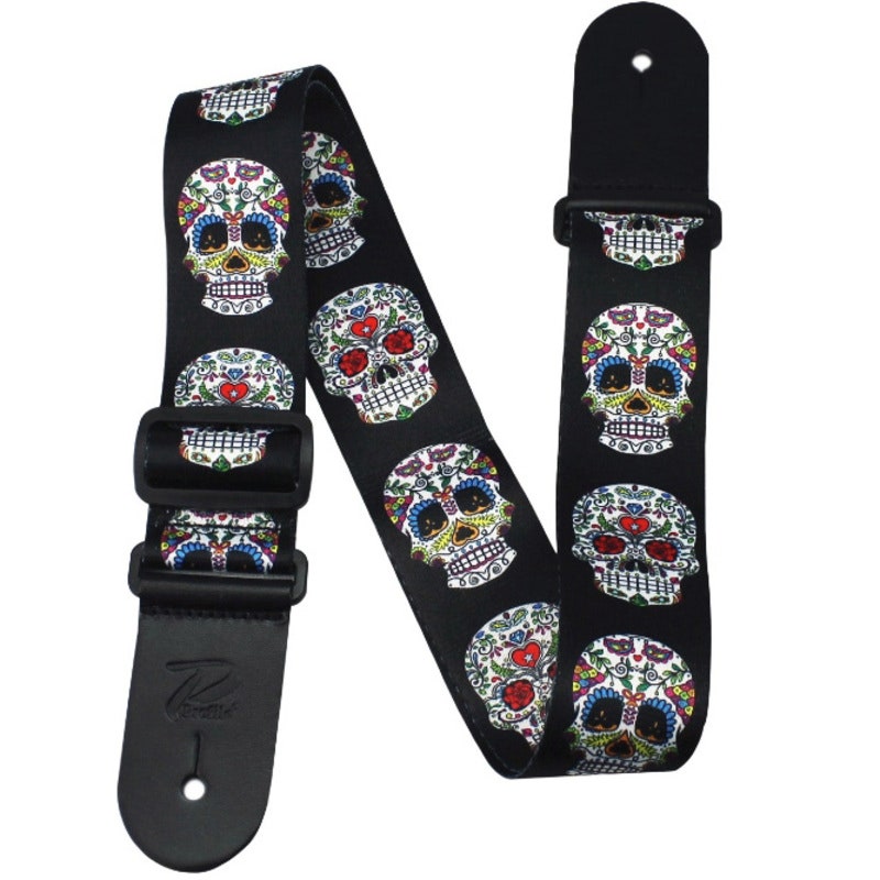 2" Terylene sublimation printed guitar strap with artist designs, leather ends and tri-glide adjustments.