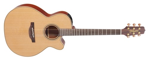Classic Takamine NEX/grand auditorium-style body with a comfortable Venetian cutaway, elegant appointments, smooth playability and state-of-the-art onboard electronics. The solid cedar top features X bracing and ivory binding, with dark purfling and a gorgeous concentric-ring rosette with wood marquetry. An elegant Venetian cutaway offers optimum access to the upper registers. The unique Takamine split-saddle bone bridge provides faultless intonation and excellent acoustic coupling to the top.