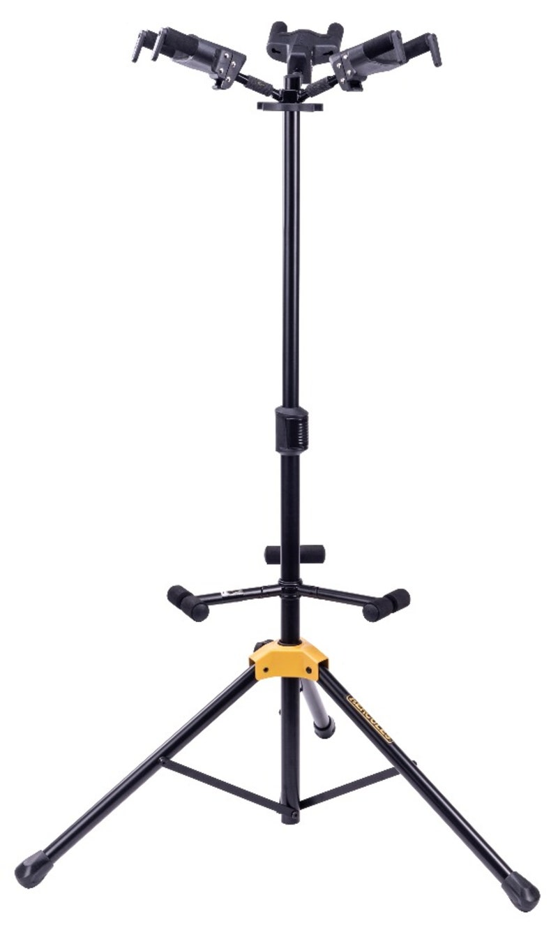 The HERCULES Triple Guitar Stand GS432B PLUS accommodates three instruments and features the upgraded foldable Auto Grip System (AGS) yokes, Instant Height Adjustment Clutch, Specially Formulated Foam (SFF) rubber contacts and the adjustable back rests.