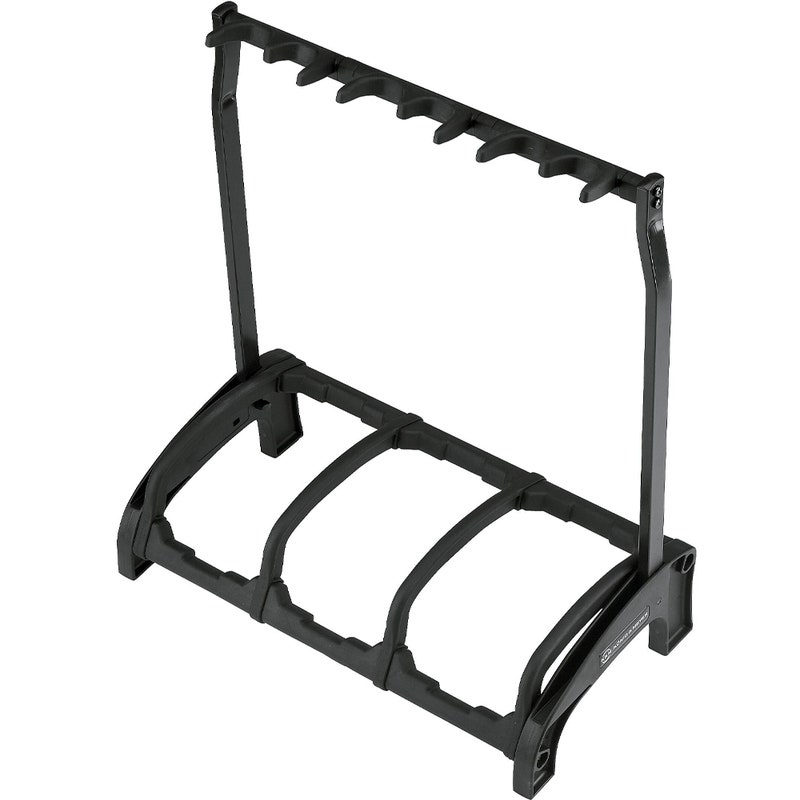 Holds 3 guitars securely, saves space and allows you an easy overview of your guitars. Ideal for use in the studio, on stage in a shop or at home. No matter whether you have acoustic, electrical or bass guitars, the special instrument-compatible supports protectively hold max. 3 guitars. The protective bars stop the guitars from rotating and prevent inadvertent removal or knocks or bumps when taking the guitars from the stand or placing them. The soft pads made of high quality thermoplastic elastomer have cushioning characteristics. Therefore they protectively take the weight of the guitar and avoid damages of the instrument. The innovative folding mechanism used on the - Guardian« allows the stand to be carried easily and it can be left standing upright. Highly flexible, sub-divided support arms with integrated pick holders mean the guitar can be held from either side (right or left) and that the strings are untouched. The structural design allows the - Guardian« to be positioned against a wall.