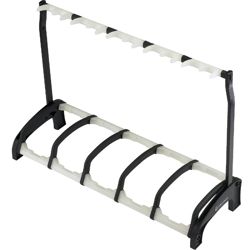 Holds 5 guitars securely, saves space and allows you an easy overview of your guitars. Ideal for use in the studio, on stage in a shop or at home. No matter whether you have acoustic, electrical or bass guitars, the special instrument-compatible supports protectively hold max. 5 guitars. The protective bars stop the guitars from rotating and prevent inadvertent removal or knocks or bumps when taking the guitars from the stand or placing them. The soft pads made of high quality thermoplastic elastomer have cushioning characteristics. Therefore they protectively take the weight of the guitar and avoid damages of the instrument. The innovative folding mechanism used on the - Guardian« allows the stand to be carried easily and it can be left standing upright. Highly flexible, sub-divided support arms with integrated pick holders mean the guitar can be held from either side (right or left) and that the strings are untouched. The structural design allows the - Guardian« to be positioned against a wall.